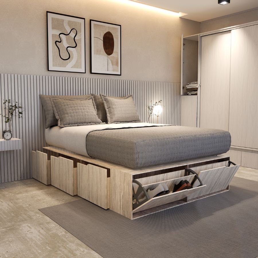 Funcional y elegante, la cama Icon de 1,60 x 2,00 m es ideal para quienes necesitan organización sin sacrificar diseño. Dispone de 6 cajones laterales con correderas metálicas, fabricada en MDP de 15 mm revestido en melamina, soporta hasta 300 kg. Su estructura sólida incorpora rejilla para ventilación del colchón, y está disponible en ocho tonos diferentes para combinar con todo tipo de dormitorios.