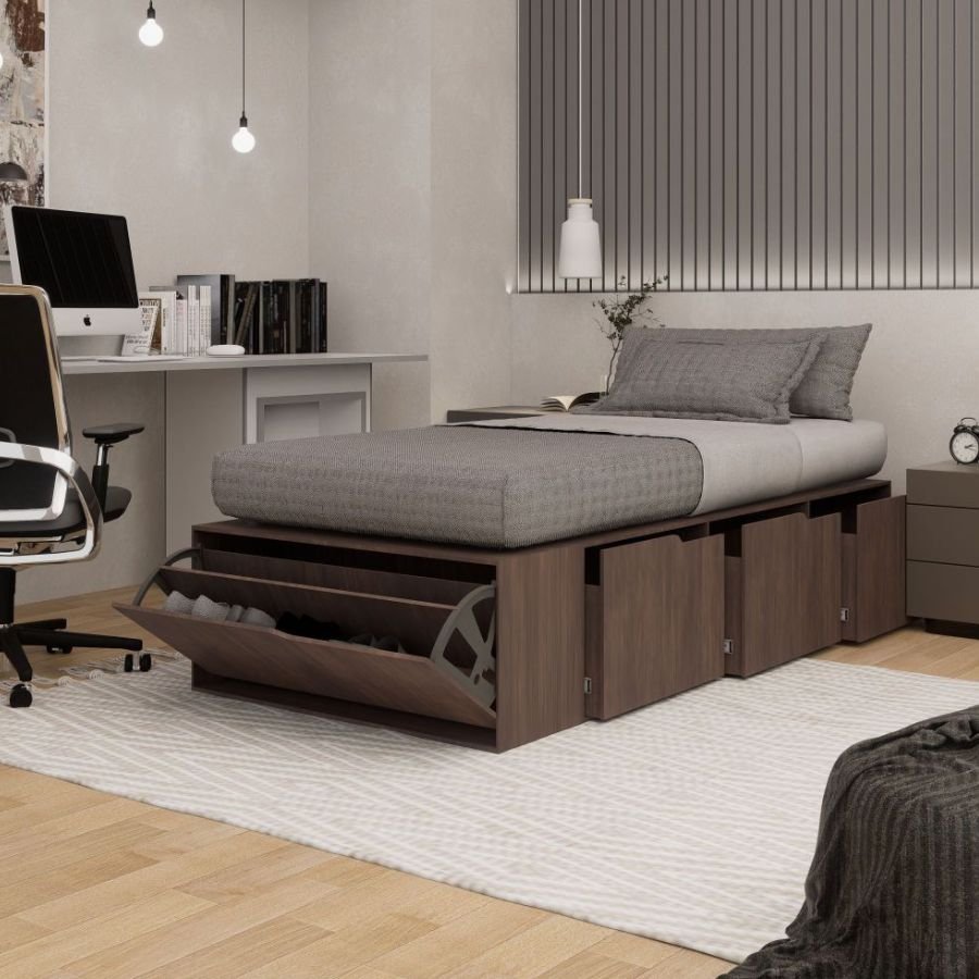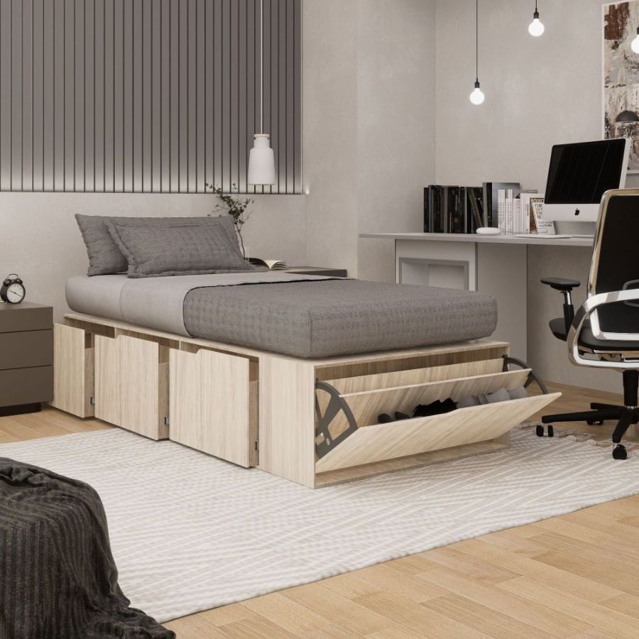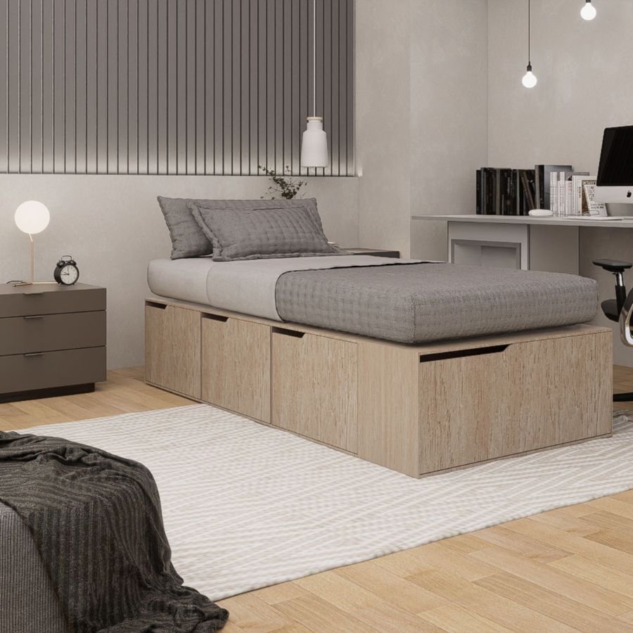 La cama de una plaza Día es una opción funcional y práctica para quienes buscan optimizar el espacio sin resignar diseño. Cuenta con 3 amplios cajones laterales con correderas metálicas, un zapatero para 6 pares y rejilla de ventilación para el colchón. Fabricada en MDP de 15 mm revestido en melamina, soporta hasta 150 kg. Apta para colchones de 80 o 90 x 200 cm, está disponible en múltiples colores y es ideal para dormitorios juveniles o habitaciones pequeñas.
