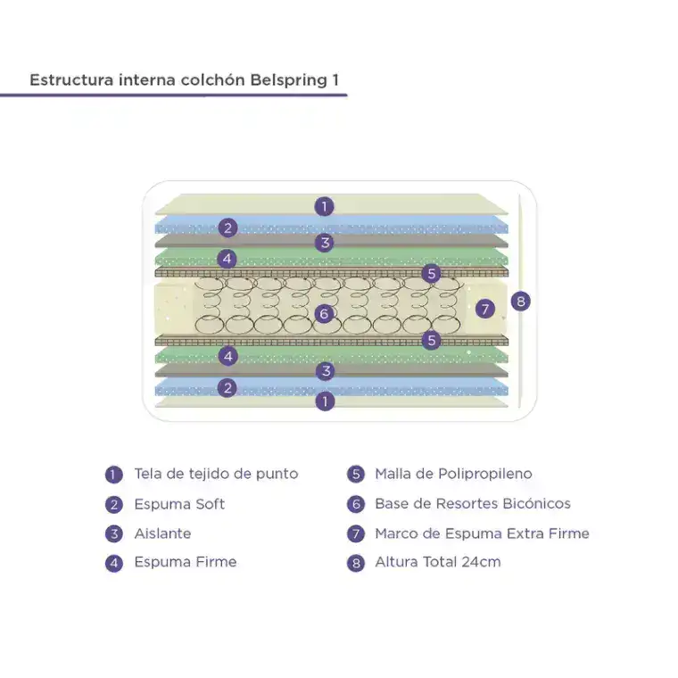 El Colchón 1 Plaza y Media Belmo Resortes Belspring 1 está diseñado para brindarte un descanso excepcional con la combinación perfecta de soporte y confort. Equipado con tecnología de resortes Belspring, este colchón proporciona un soporte firme y equilibrado, adaptándose a los contornos del cuerpo y asegurando una noche de sueño ininterrumpido. Medidas: 190 cm (largo) x 90 cm (ancho) x 24 cm (alto). Material: Núcleo de resortes Belspring independientes y cubierta de tela suave y transpirable. Peso máximo soportado: 130 kg por persona.