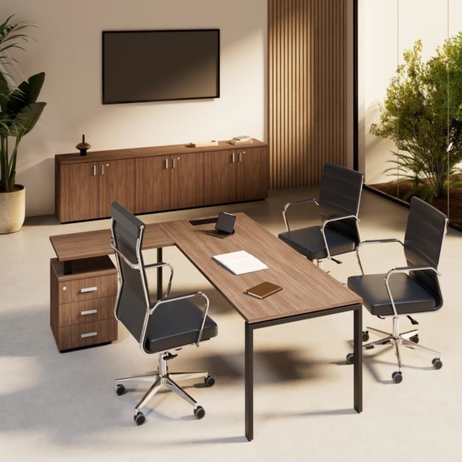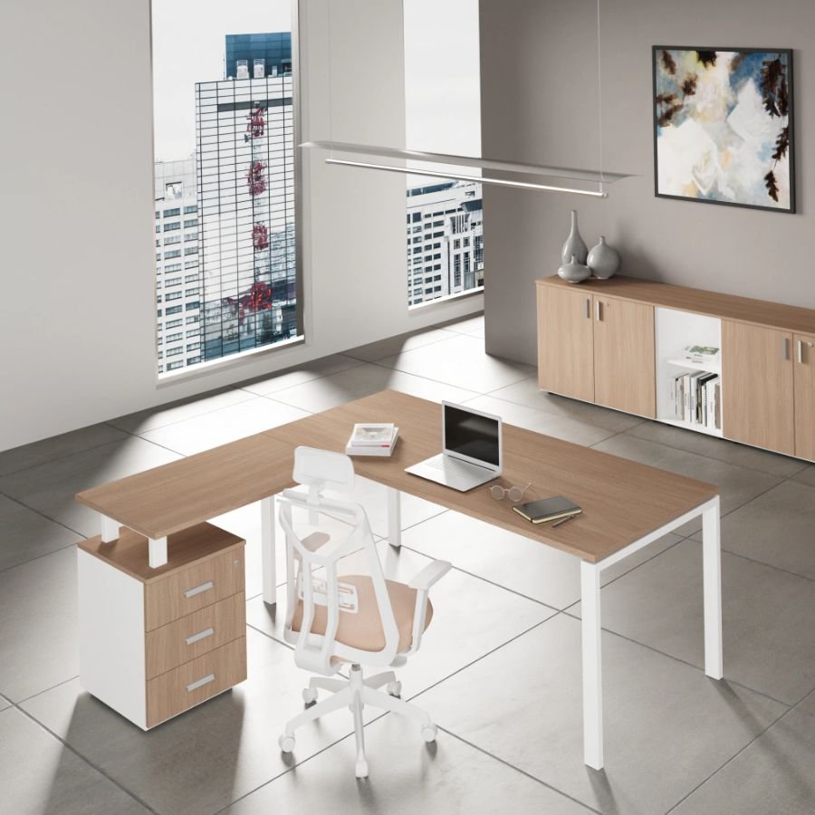 El Escritorio Osiris es la solución ideal para quienes buscan maximizar su espacio de trabajo. Su diseño en L con cajones incorporados permite una organización eficiente sin perder estilo. Estructura en melamina de alta calidad ofrece resistencia y un acabado impecable, ideal para oficinas y espacios profesionales.