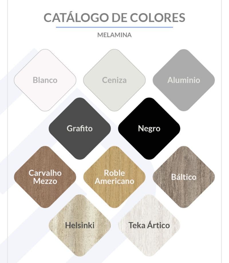 - Opciones de melamina: Blanco, Ceniza, Gris Grafito, Negro, Carvalho Mezzo, Helsinki, Teka Ártico.