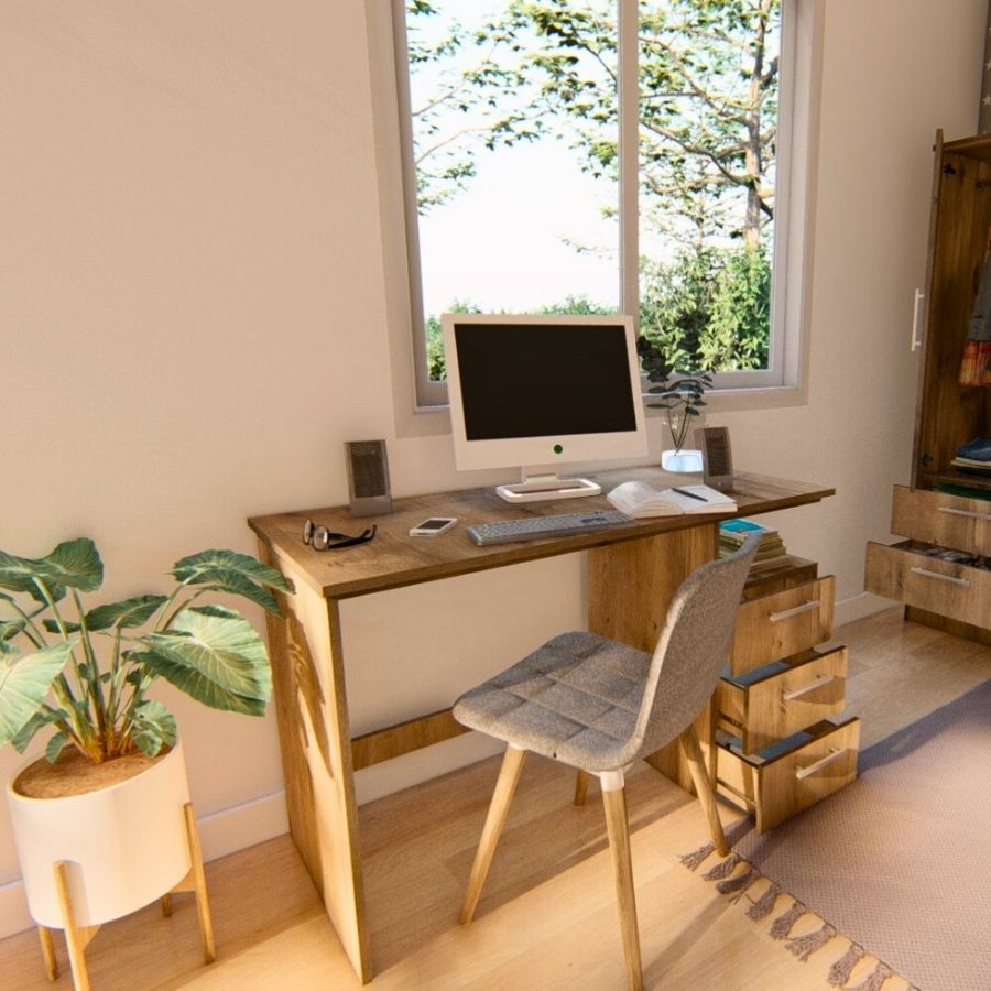El escritorio Elo es una opción compacta y funcional. Su estructura de MDP de 15 mm con tapa reforzada a 30 mm garantiza durabilidad. Posee tres cajones con correderas metálicas y manijas minimalistas, ideales para almacenar documentos y accesorios. Disponible en tonos elegantes, se adapta a cualquier entorno laboral o doméstico.