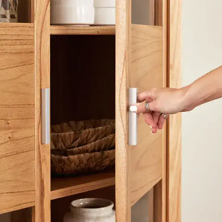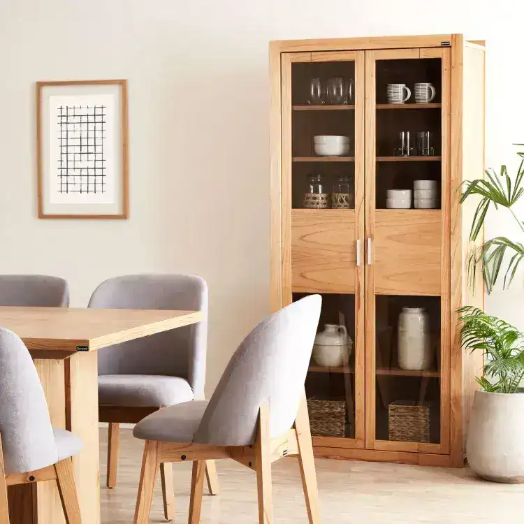 La Vitrina Nórdica Paraíso Jade combina elegancia y practicidad en un solo mueble. Fabricada en madera de Paraíso, cuenta con puertas de vidrio que permiten exhibir objetos decorativos, vajilla o colecciones especiales, manteniéndolos protegidos del polvo.