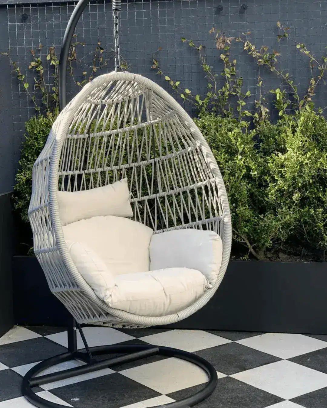 Fabricada con rattán sintético de alta calidad y una sólida estructura de metal macizo pintado de blanco, esta hamaca es resistente y elegante.