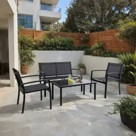 El juego Reims está diseñado en una línea moderna, ideal para espacios exteriores como jardines y terrazas. Este set de 4 piezas está compuesto por una estructura de metal pintada en color negro bajo el proceso powder coating, lo que le otorga mayor durabilidad frente a la intemperie. La combinación de tela textilene en los asientos ofrece frescura y comodidad en climas cálidos.