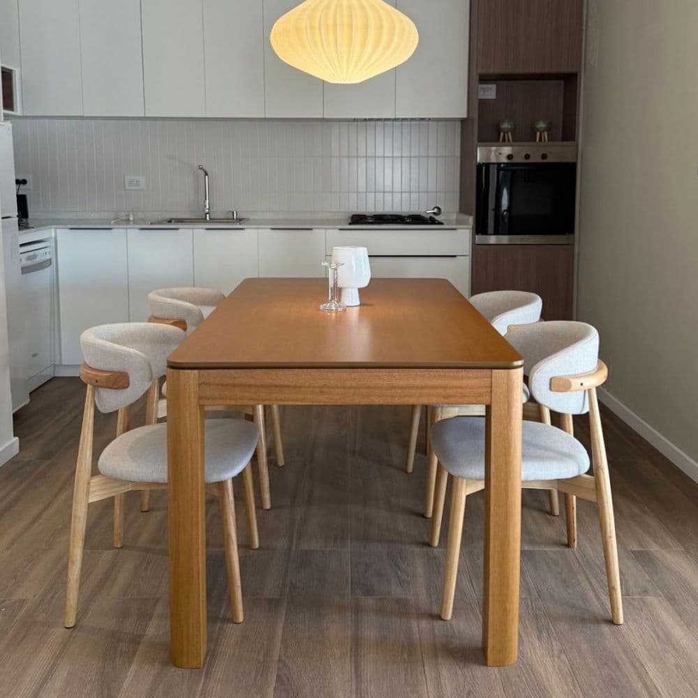 Una mesa de diseño elegante y robusto, fabricada 100% en eucaliptus Grandis. Su tapa con bisel a 45° y esquinas redondeadas se combina con patas redondeadas de 4×4, logrando una estética moderna y atemporal. Disponible en varios tamaños para adaptarse a distintos espacios, es perfecta para transformar tu comedor en un ambiente cálido y sofisticado.