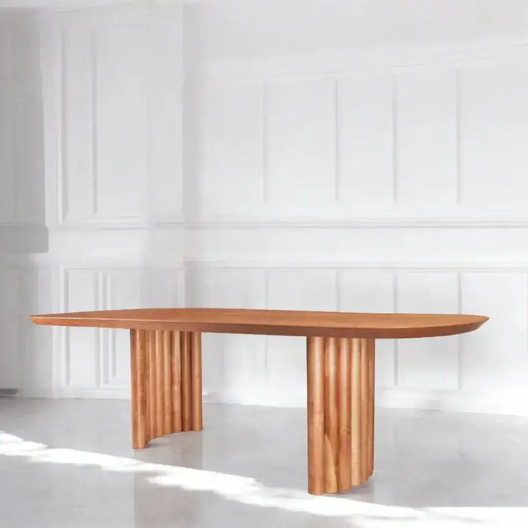 Con un diseño ovalado sofisticado, esta mesa está disponible en tres tamaños: 200×100 cm, 220×100 cm y 240×110 cm, todas con una altura de 77,3 cm. Construida en madera maciza de Lenga Patagónica, presenta un acabado en poliuretano extra resistente y tratamiento antimancha, combinando estética y funcionalidad.
