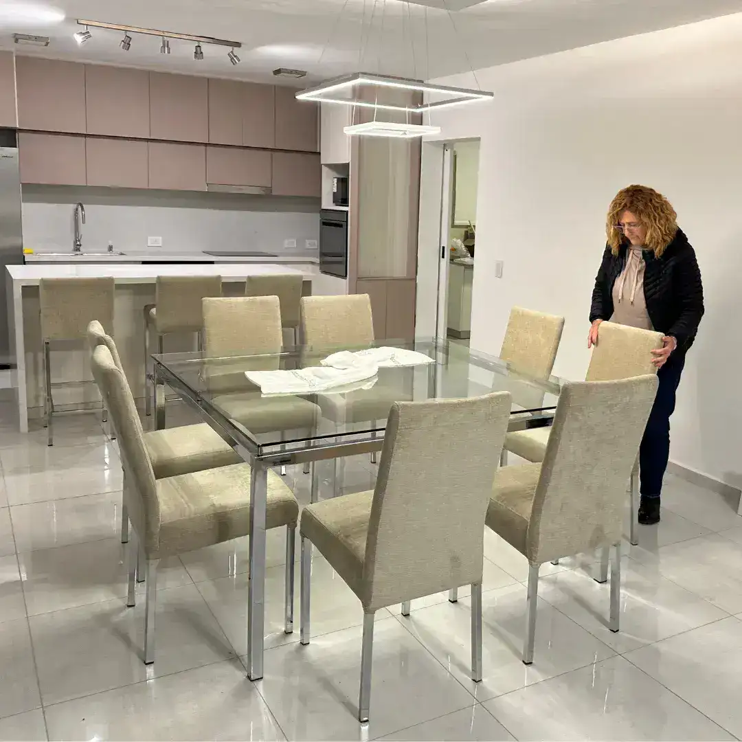 Es la ideal para quienes buscan un estilo contemporáneo y elegante en su comedor. Su diseño moderno combina una base robusta de caño cromado con una superficie de vidrio templado, creando un equilibrio perfecto entre durabilidad y sofisticación. Esta mesa es perfecta para añadir un toque de luz y amplitud a cualquier espacio, gracias a su tapa de vidrio que refleja la luz de manera suave y natural.