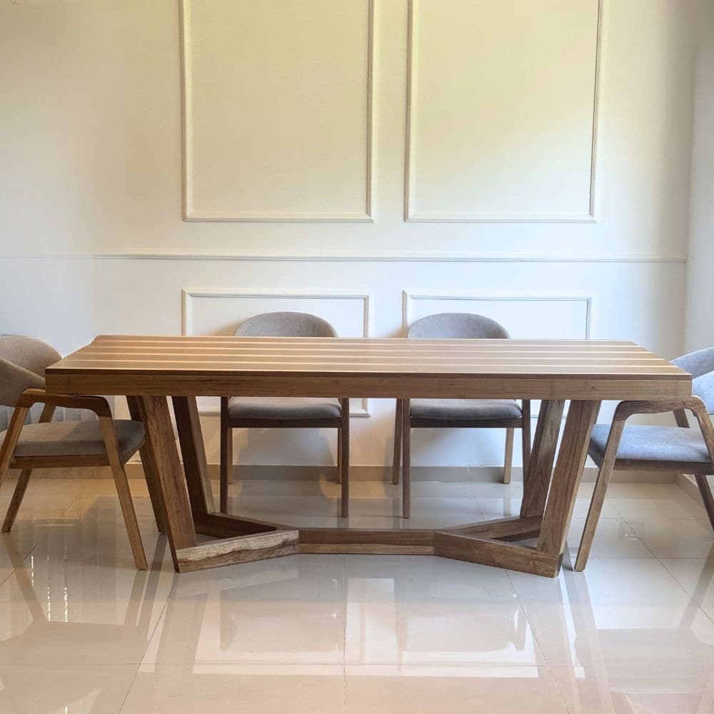 La mesa Roma es sinónimo de elegancia contemporánea y diseño funcional. Fabricada en madera maciza de Paraíso o Petiribí, combina líneas puras con una estructura robusta que garantiza estabilidad y durabilidad. Su tapa de 18 mm —con opción de doble regrueso de 36 mm— aporta una presencia sólida y refinada, ideal para comedores amplios y modernos.
