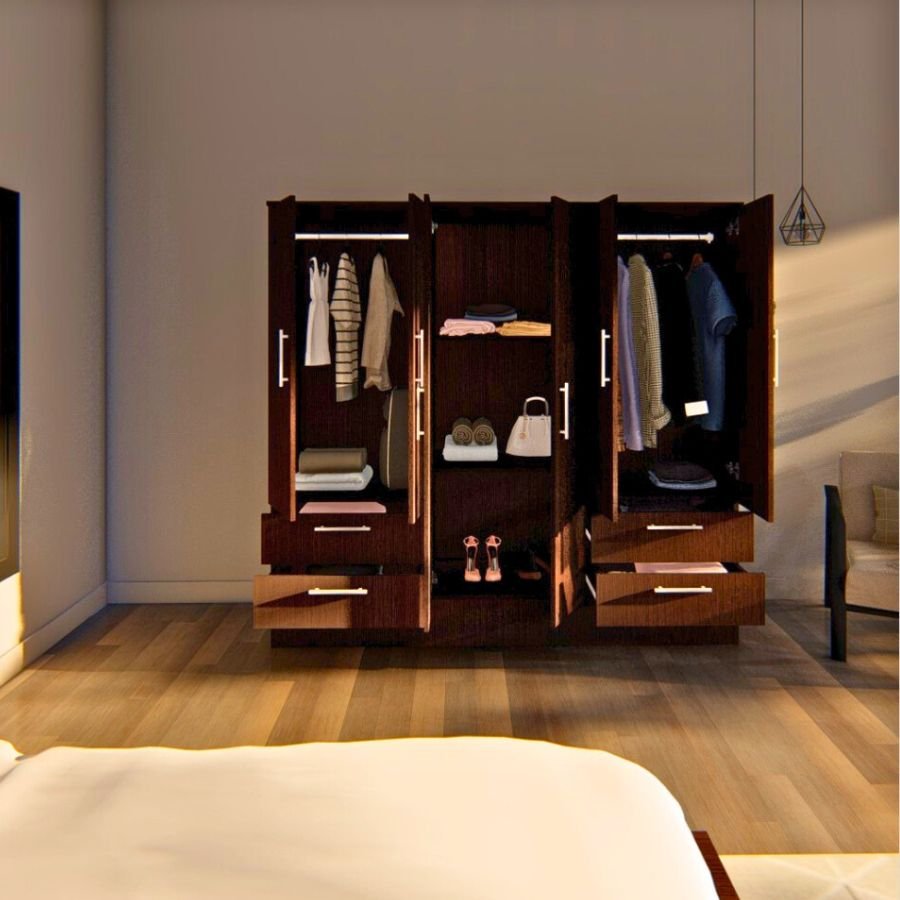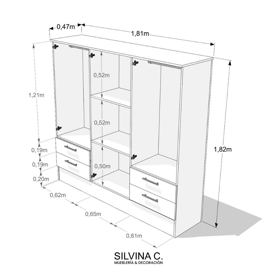Este placard de 1,80 m ofrece una excelente distribución interior con 6 puertas, 4 cajones exteriores y 3 compartimientos amplios con estantes regulables. Fabricado en melamina de 15 mm con detalles modernos como manijas minimalistas y regatones antihumedad. Perfecto para organizar ropa, accesorios y calzado con estilo y eficiencia.
