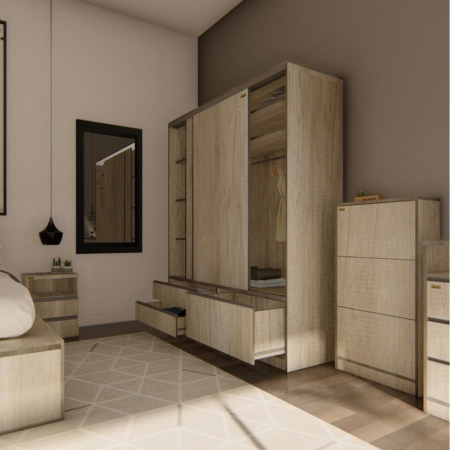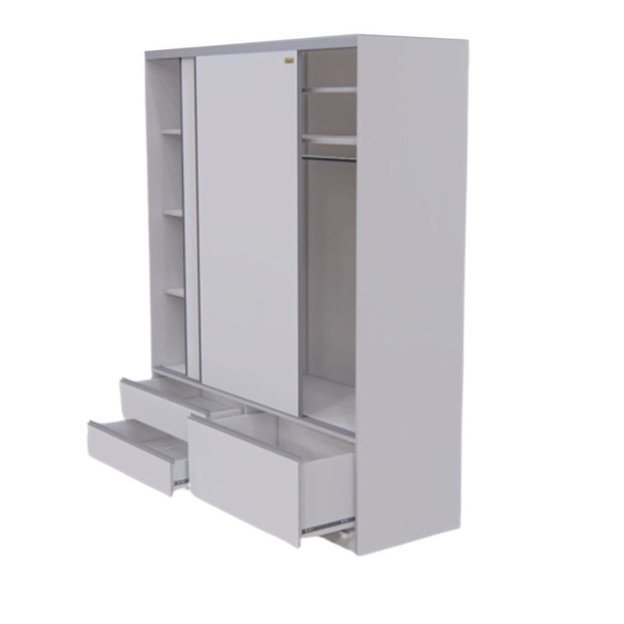 Diseñado para quienes necesitan más espacio sin perder diseño, este placard de 1,80 m ofrece 2 cajones exteriores de gran tamaño, un zapatero amplio y puertas corredizas sobre guías de aluminio anodizado. Su interior está perfectamente distribuido con estantes y barra de colgado, brindando un guardado eficiente. Fabricado en melamina de alta calidad, con regatones antihumedad y correderas telescópicas.