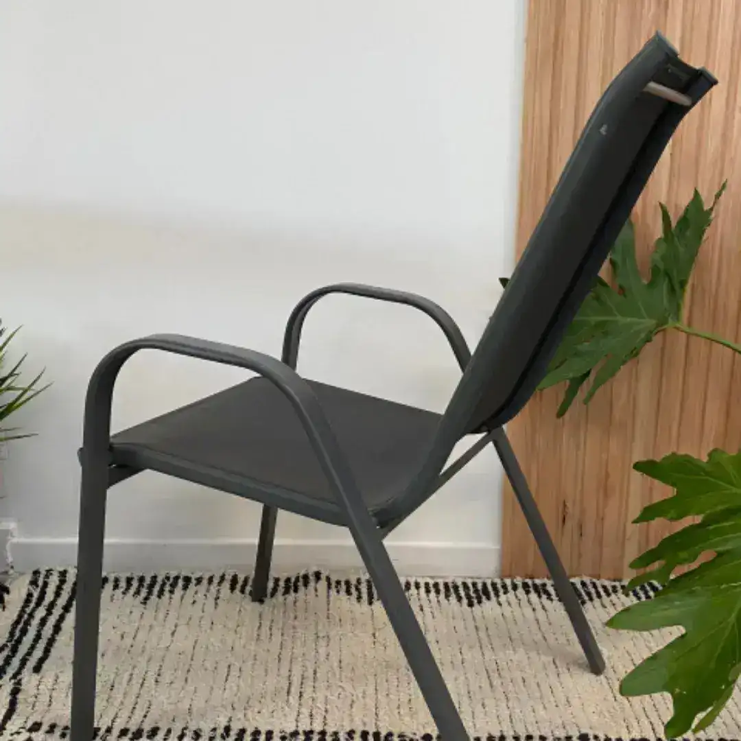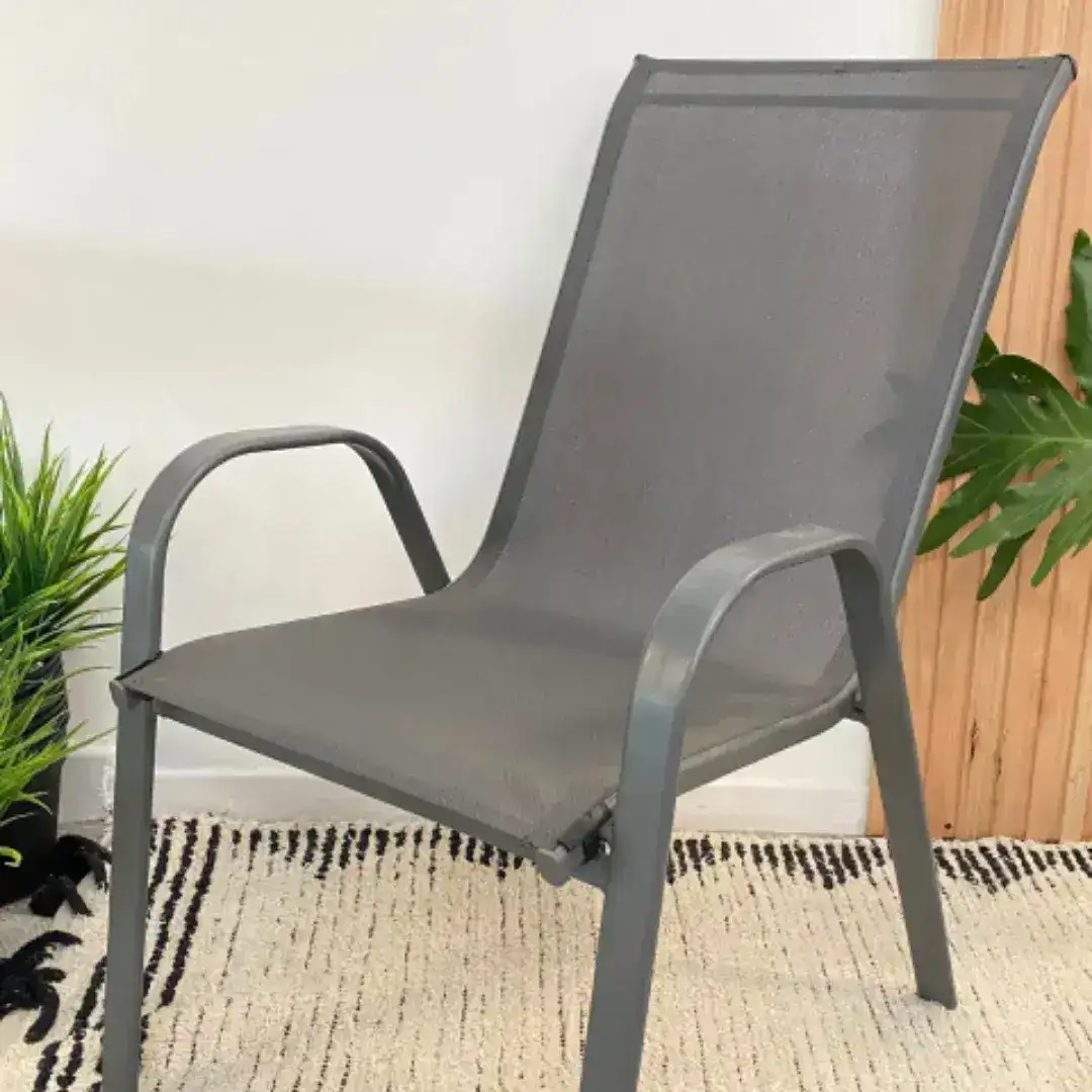 La Silla Saona es una silla apilable de jardín fabricada en hierro con acabado negro y asiento en textileno, ideal para exteriores. Su estructura resistente la hace perfecta para terrazas, balcones y jardines, y al ser apilable, facilita el almacenamiento cuando no está en uso.