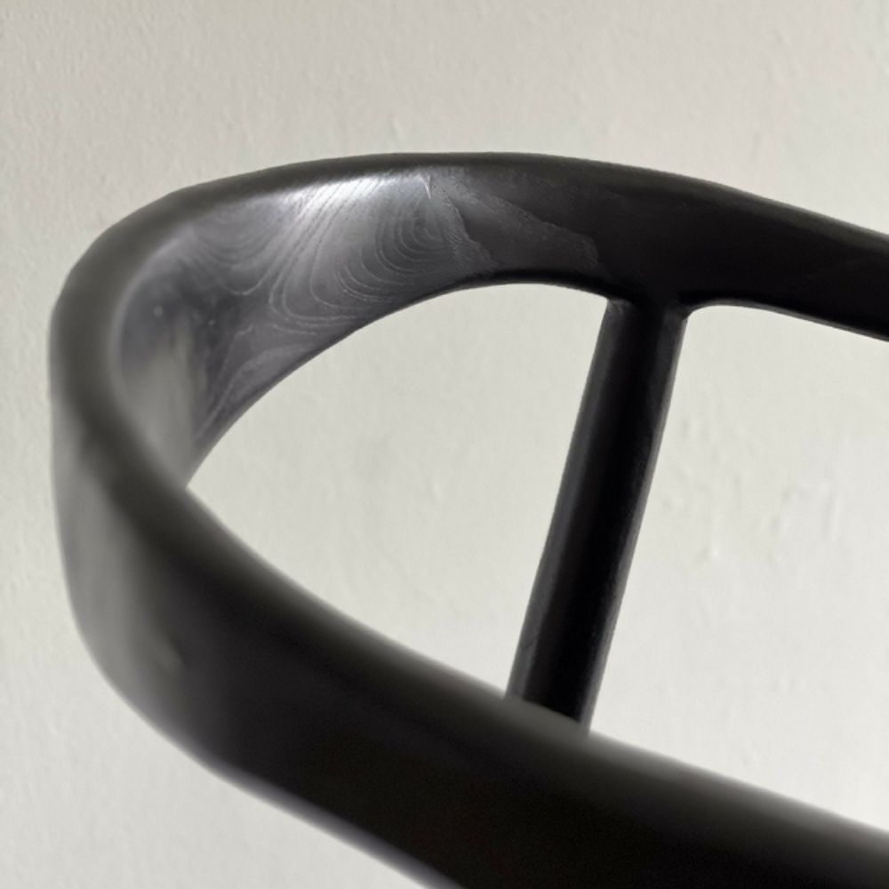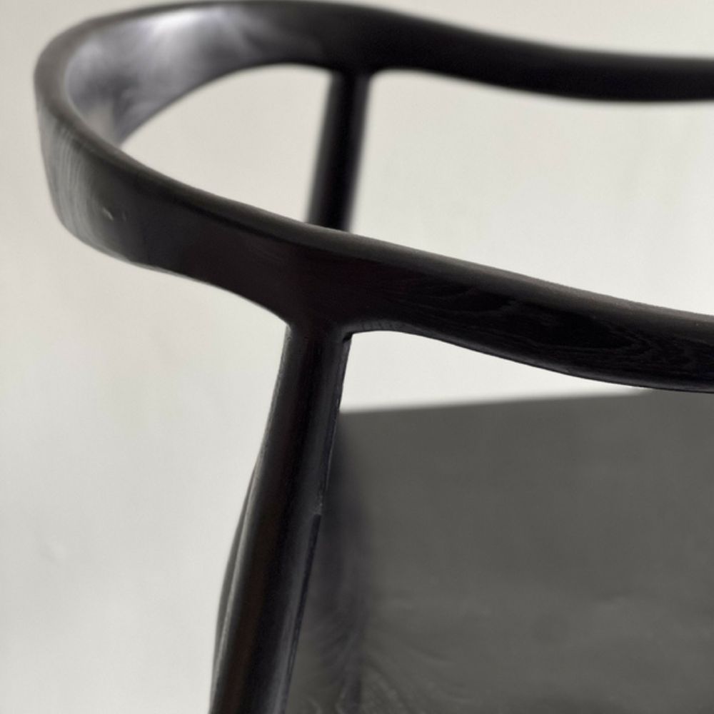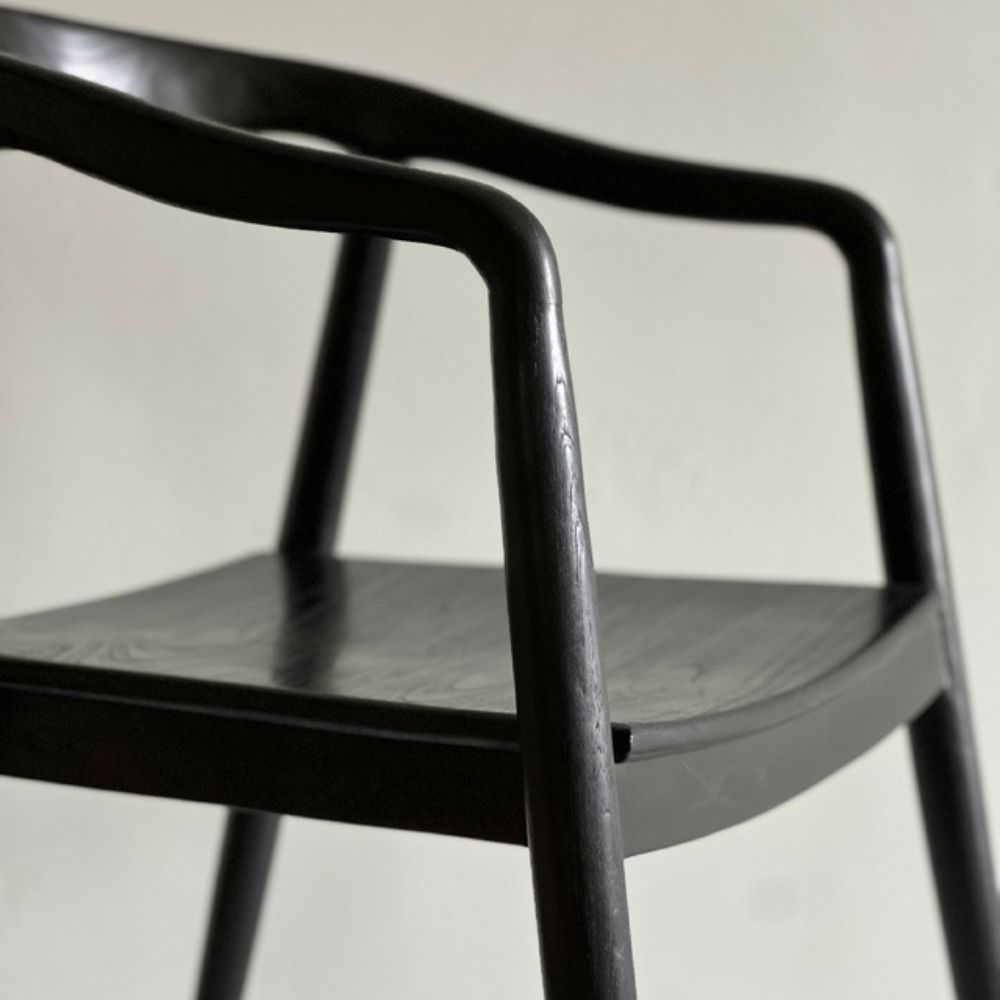 Una versión sofisticada en madera de teka maciza teñida en negro. Presenta apoyabrazos ergonómicos y diseño con patas rectangulares, combinando contraste y elegancia. Con medidas de 76 cm de alto, 49 cm de ancho, 50 cm de profundidad y altura de asiento de 44 cm, es una pieza sólida que destaca en espacios contemporáneos o minimalistas.