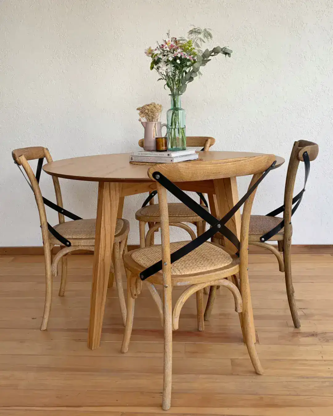 La Silla Closs, elaborada en madera de haya, fusiona la calidez natural con un toque nórdico. Su respaldo cruz metálico y asiento de ratán realzan su elegancia. Con medidas de 44 cm de ancho, 87 cm de alto total, 47 cm de altura del asiento y 42 cm de profundidad del asiento, brinda comodidad y estilo.