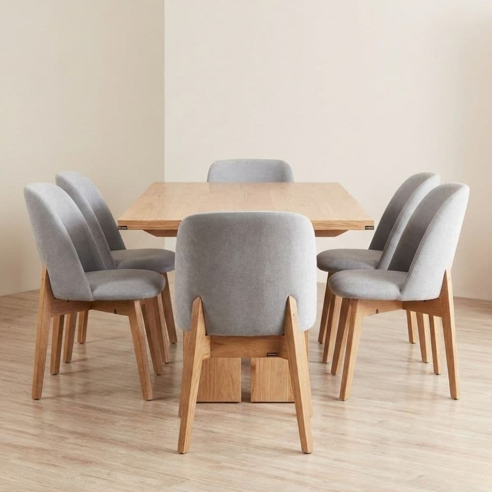 La Silla comedor Nórdica Sami combina líneas rectas con curvas suaves, aportando un toque moderno y acogedor. Fabricada en madera maciza, su asiento y respaldo tapizados ofrecen comodidad y un diseño Escandinavo contemporáneo.