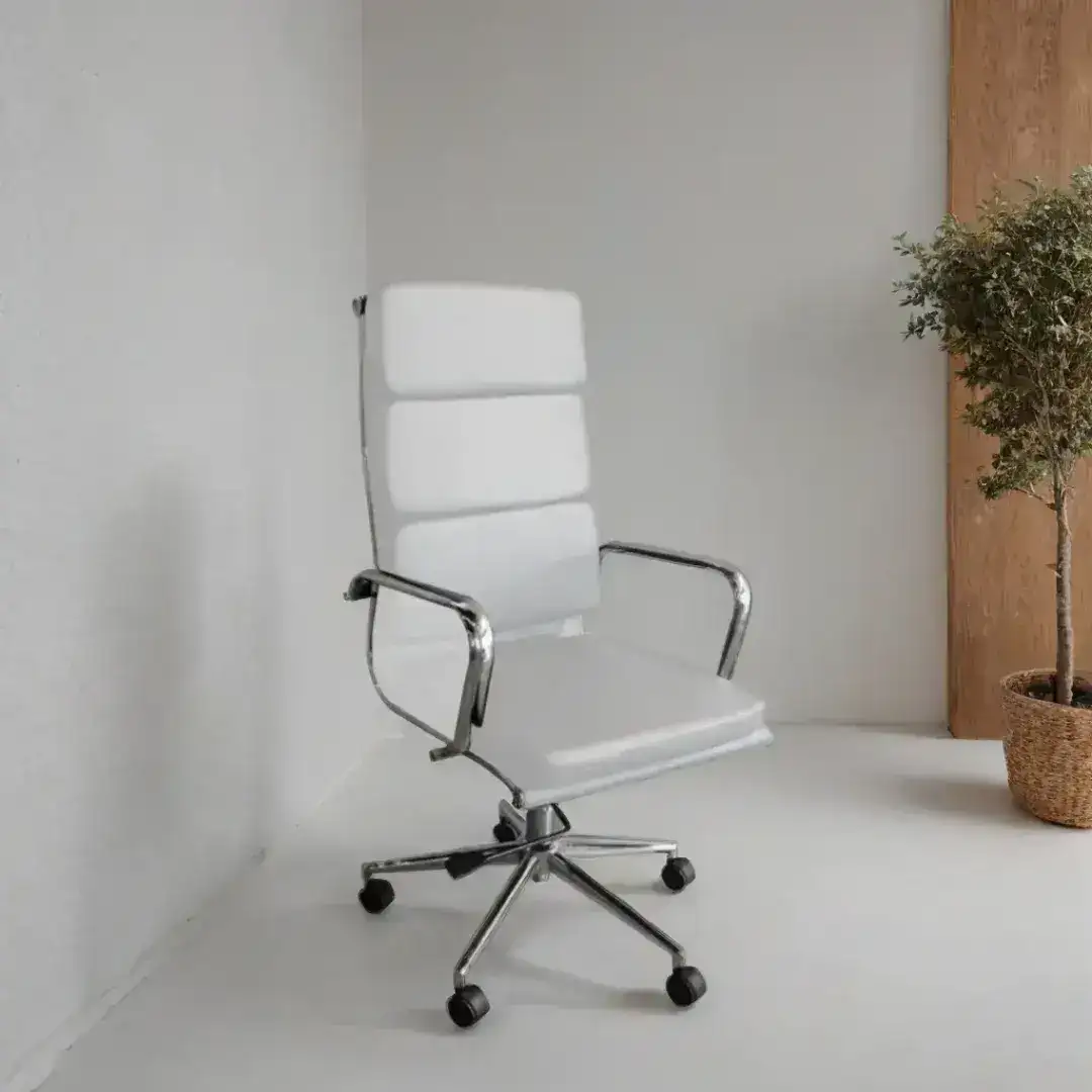 Silla de oficina alta con estructura cromada, asiento y respaldo acolchonado. Tapizada en ecocucuero. Tiene altura regulable y respaldo basculante.