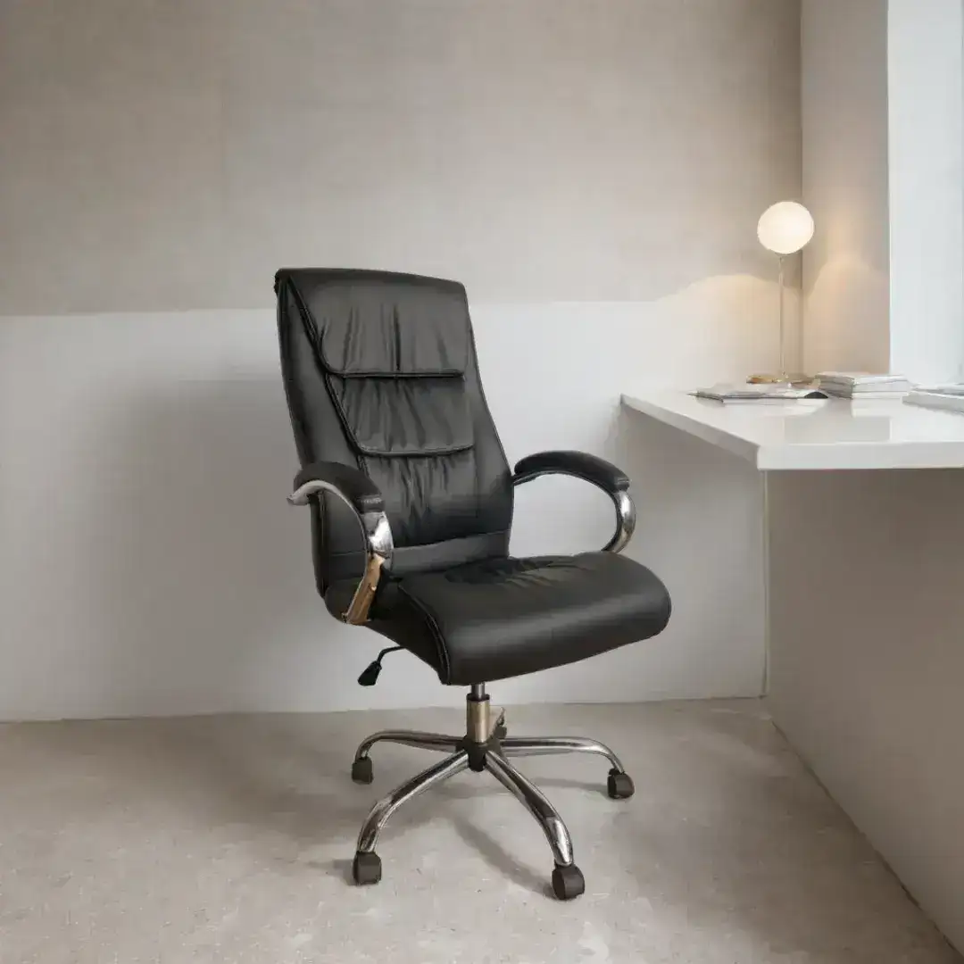 La silla Elite combina diseño y funcionalidad, ideal para oficinas que buscan un estilo ejecutivo. Tapizada en ecocuero negro, esta silla cuenta con una estructura de cromo resistente, respaldo basculante y ajuste de altura para mayor confort en el trabajo.