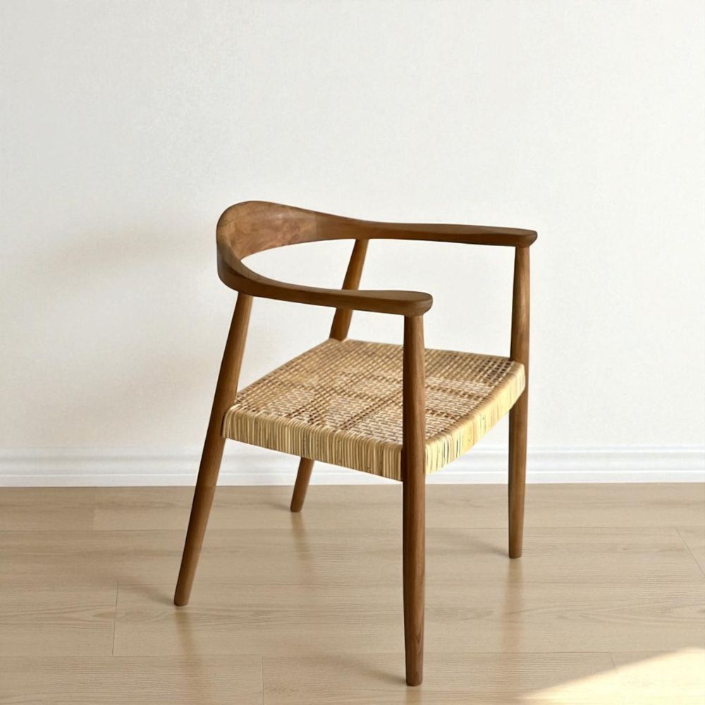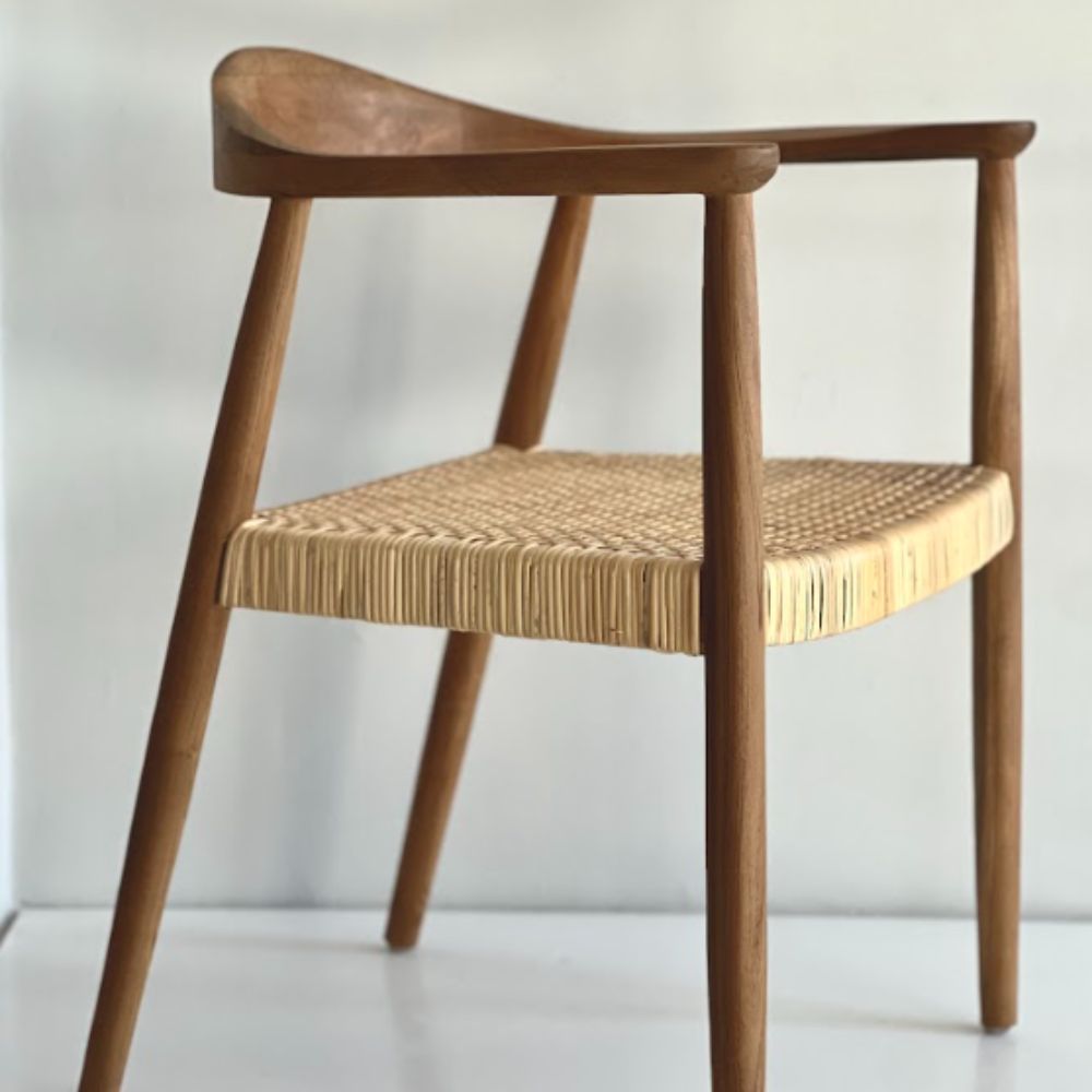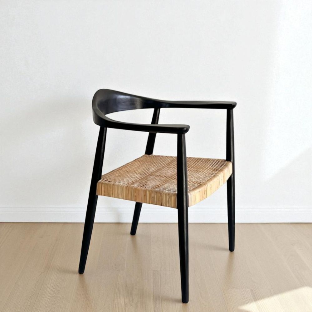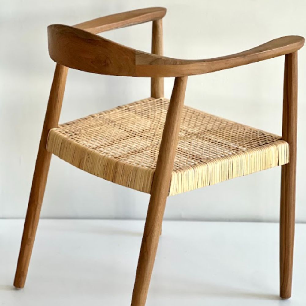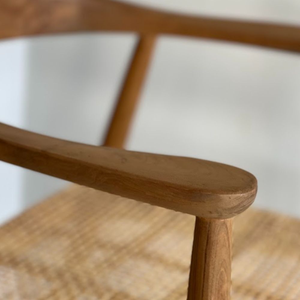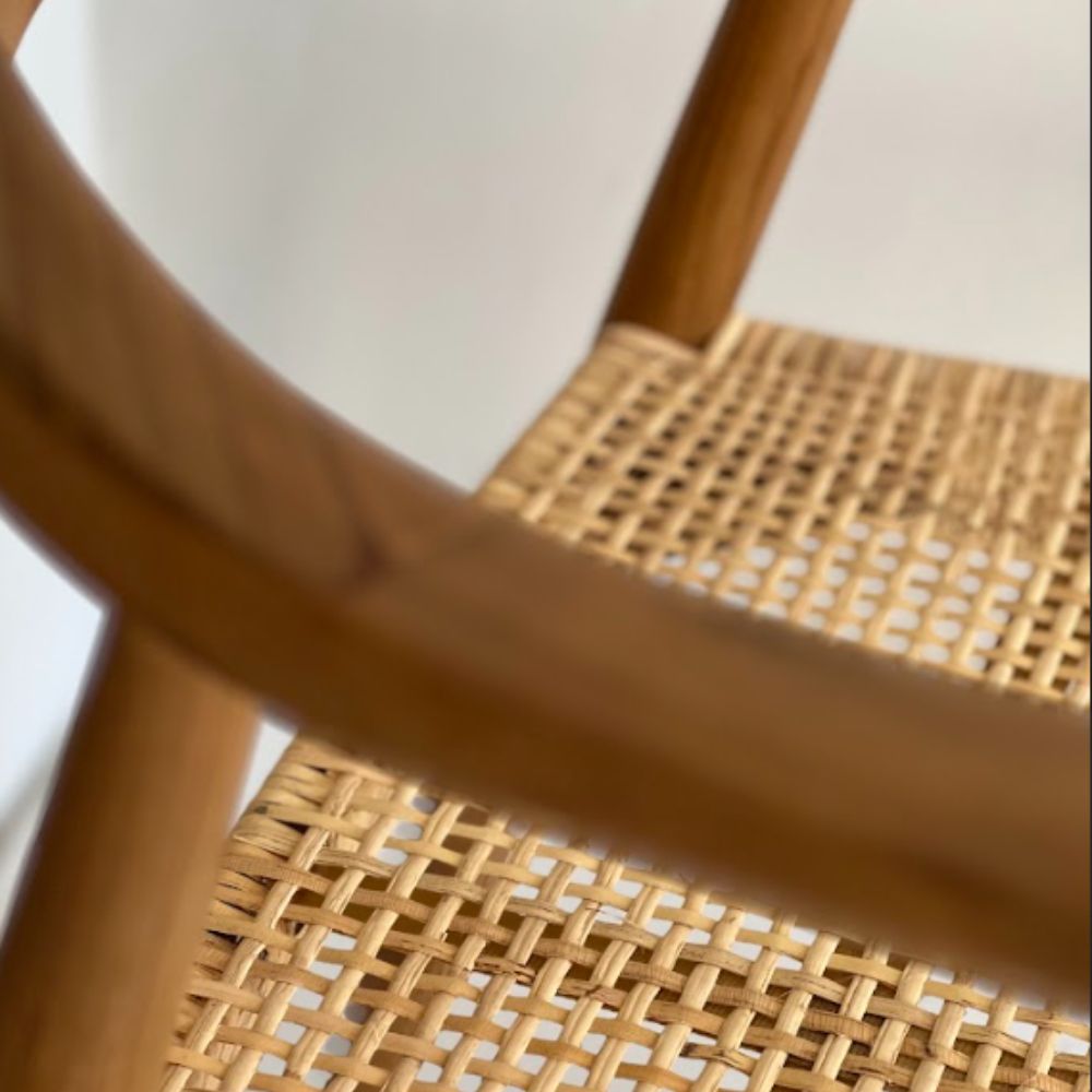 Con diseño recto y proporciones equilibradas, la silla Keny combina estructura de teka laqueada (natural o negra) con un asiento de Rattan tejido a mano. Los apoyabrazos aportan confort sin recargar visualmente, ideal para sumar sofisticación con naturalidad.