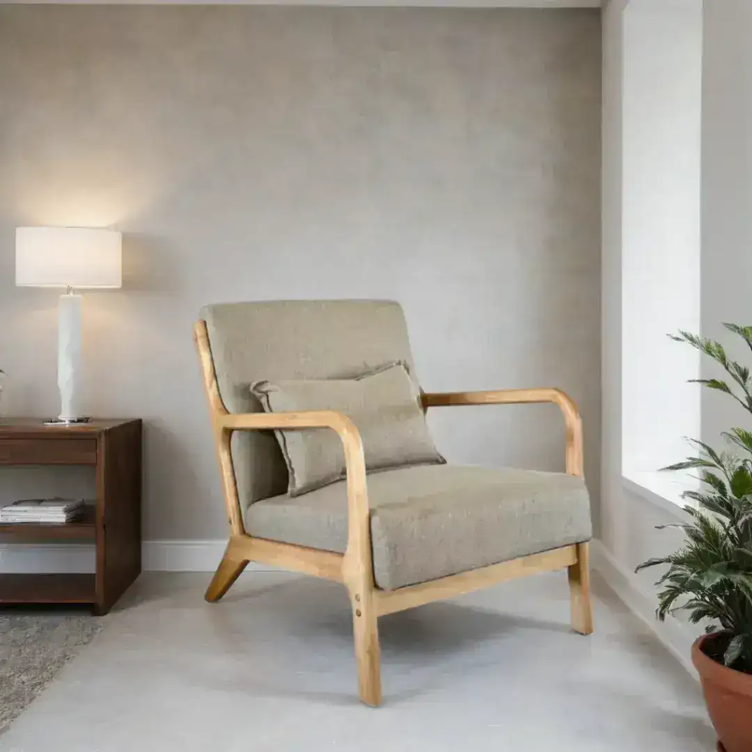El Sillón Lee ofrece un diseño nórdico con un toque cálido y minimalista, ideal para complementar cualquier sala de estar o dormitorio. Fabricado en madera de caucho de color natural, su estructura es sólida y duradera. El tapizado en chenille gris claro brinda suavidad y un aspecto elegante, mientras que el almohadón desmontable con relleno de vellón siliconado añade confort.
